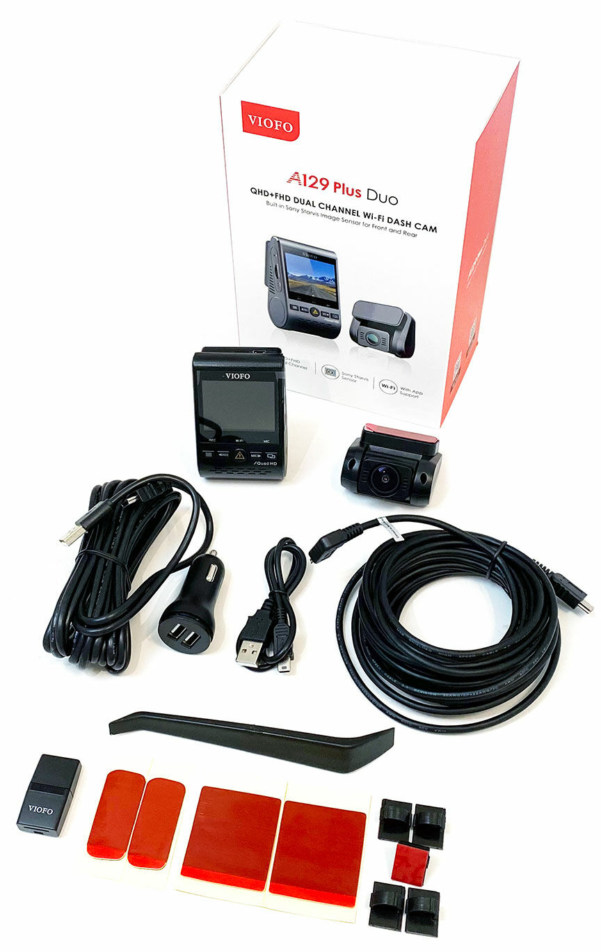 Az első és hátsó kamerán kívül a doboz tartalmaz egy dupla USB csatlakozós szivargyújtós tápkábelt, kábelrögzítő klipszeket, egy műszerfal szerszámot a kábel elrejtéséhez a műszerfal vagy a kárpit mögé, tartalék ragasztócsíkot áthelyezéshez és micro SD kártya - USB átalakítót a memóriakártya laptopon vagy számítógépen történő megtekintéséhez, valamint egy USB kábelt a kamera számítógépes csatlakoztatásához. A készlet tartalmazza az első és a hátsó kamerát összekötő kábelt is, melynek hossza 6 méter.
